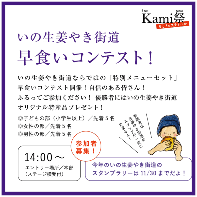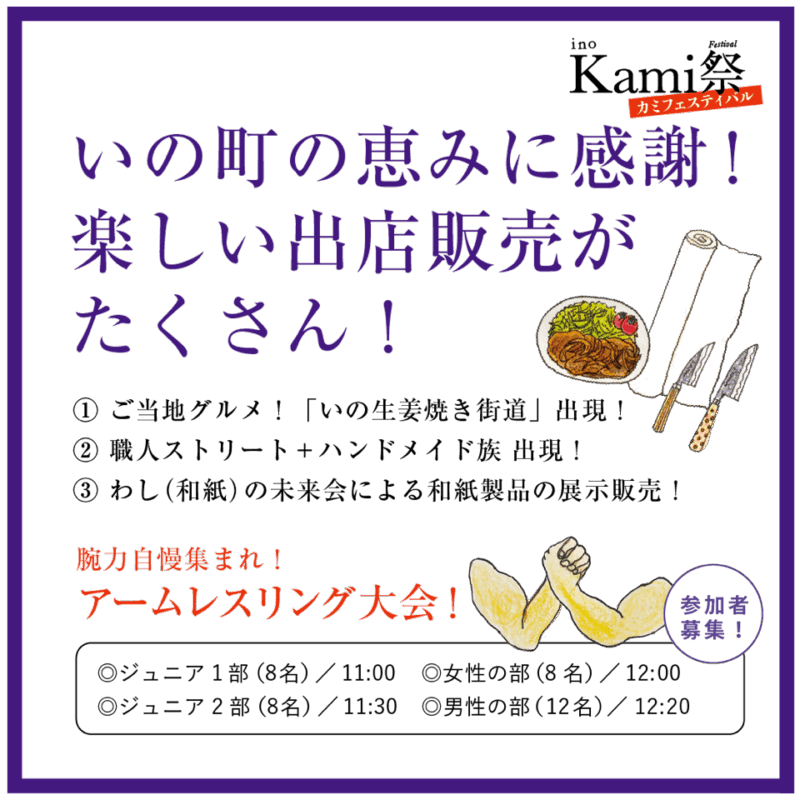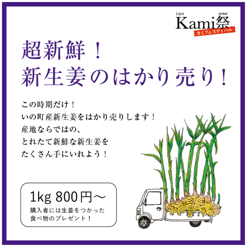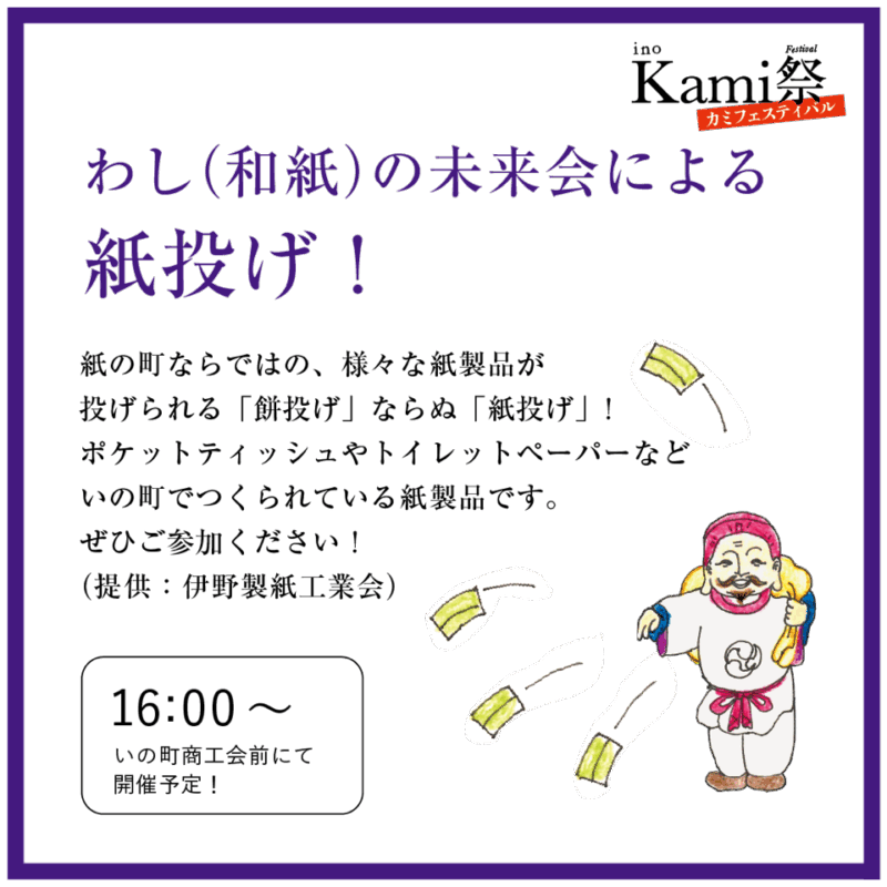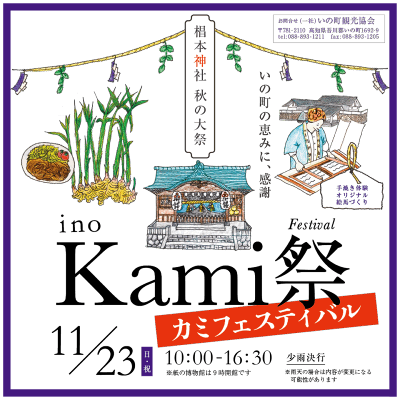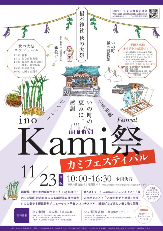 いの大国さまの秋の大祭にあわせて、「神」「紙」「ジンジャー」の町、いの町を楽しむイベントです。「土佐和紙」に触れるワークショップや特産品の生姜を使った町内飲食店による「いの生姜焼き街道」、新生姜の販売会、製紙業者による「紙投げ」、そして職人達が繰り広げる「職人ストリート」など、いの町の特産品をPRすることを目的としています。いの町を代表するお祭りに合わせて是非楽しんでください。11月23日は、いの町中心部の様々なところで催し(いの博覧会)が開催されます。