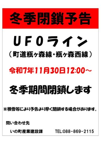 令和7年11月30日(日)12:00 より、UFOライン(いの町道瓶ヶ森線・瓶ヶ森西線)を冬期閉鎖をいたしますのでお知らせします。